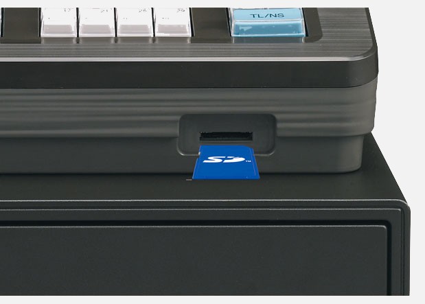 TheXE-A217Wis equipped with an SD card slot. SD cards (4Gb to 32Gb) can be used to back up various kinds of data, including daily sales and Electronic Journal data. Data (CSV file type) can be saved to an SD memory card then managed on a computer via Excel or other spreadsheet applications. Also various settings can be configured easily by using an SD card. Parameters such as the store name and logo, department names, product names, sales tax rate and others can all be configured on a computer and imported into the machine quickly and easily with an SD card.